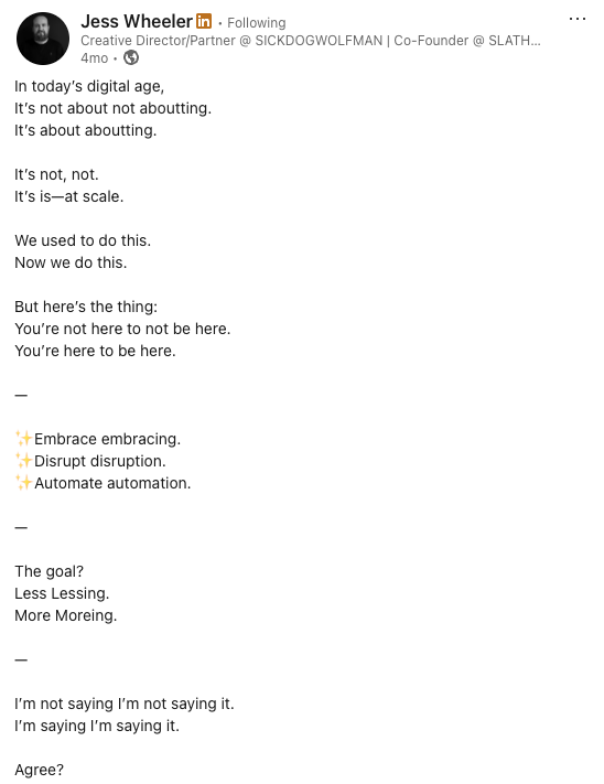 Credit to Jess Wheeler for tackling this a while back on LinkedIn (attached). He summed up perfectly just how absurd most “thought leadership” sounds now. It’s satire, but only just – which is kind of the whole problem. Have a read.